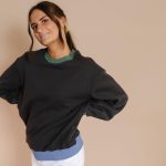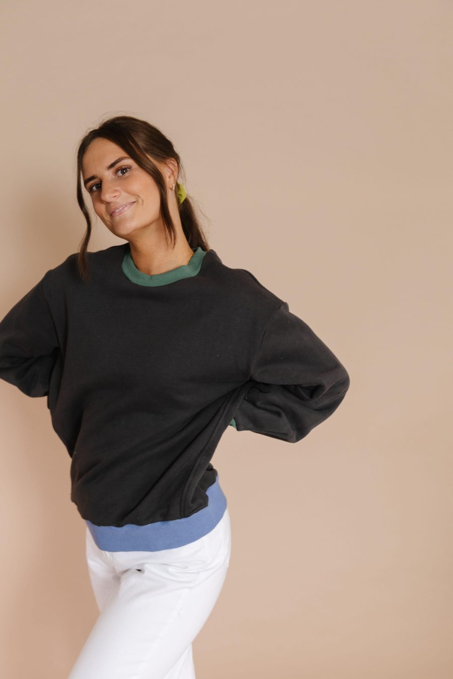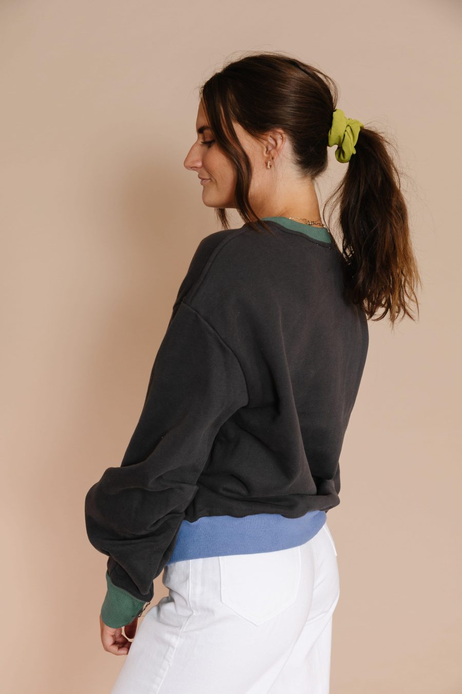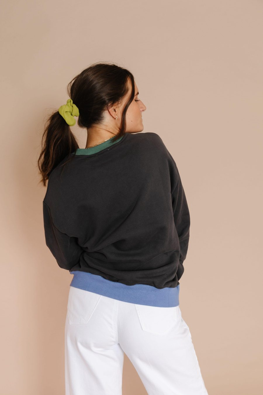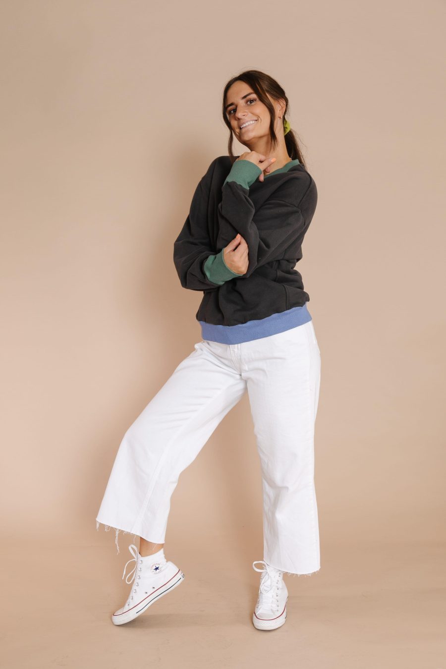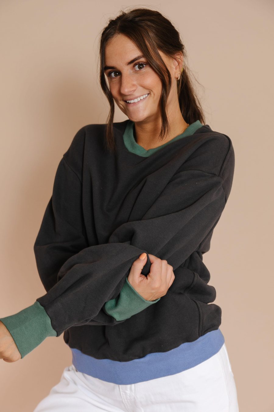 We love the simple contrast found at the collar, wrist and hem in this easy, relaxed, comfortable sweatshirt with a fun side seam and pleat details on the sleeve.