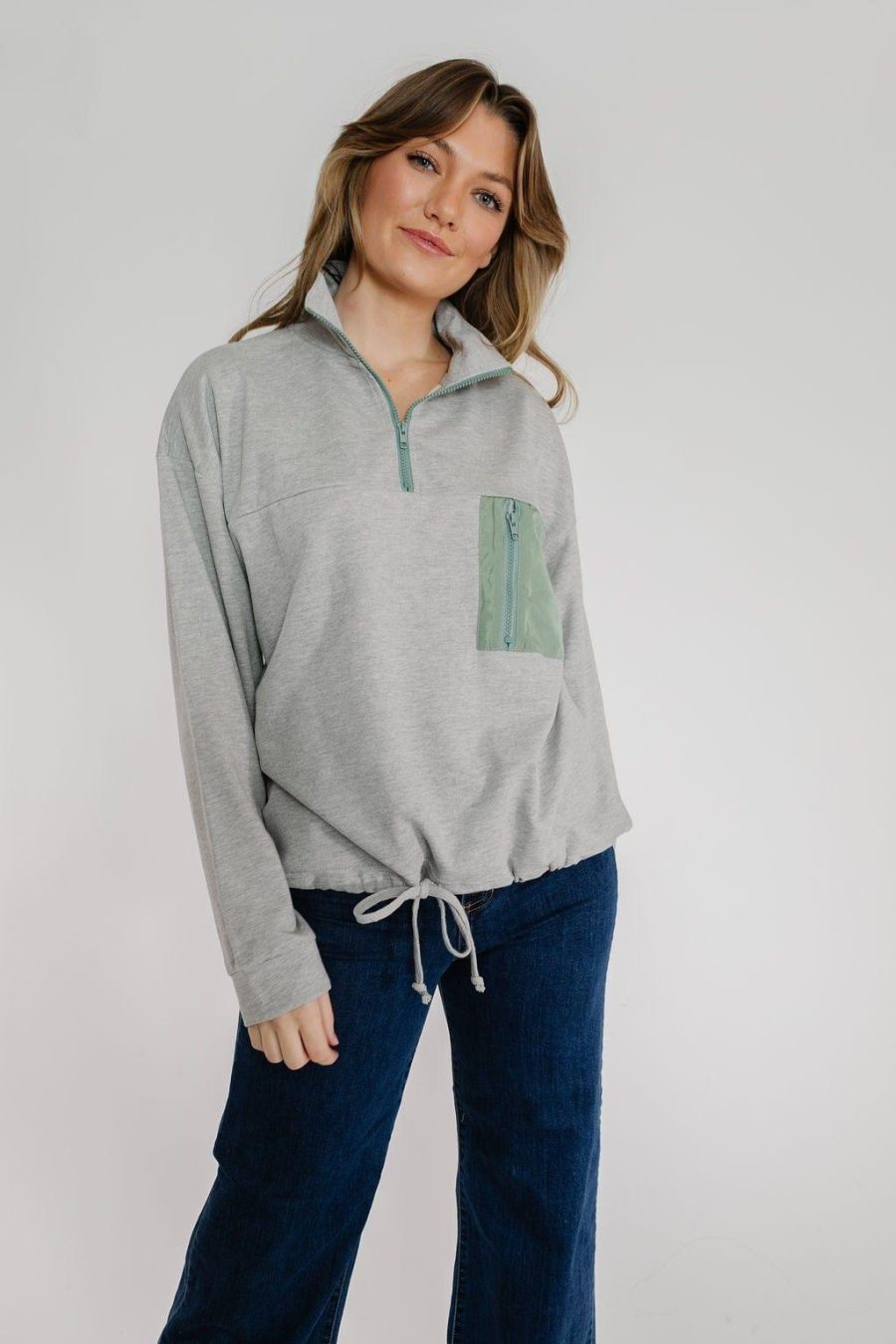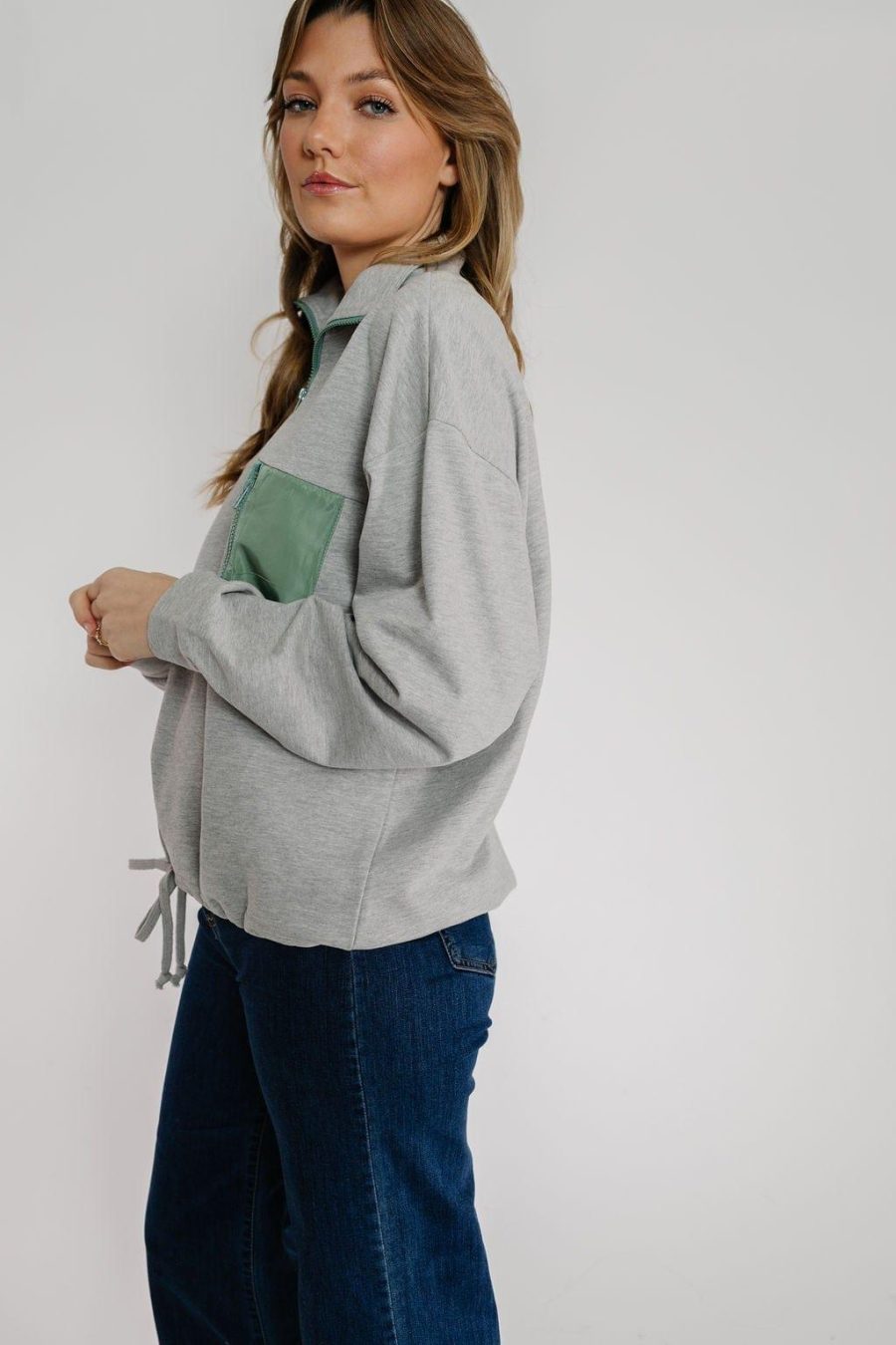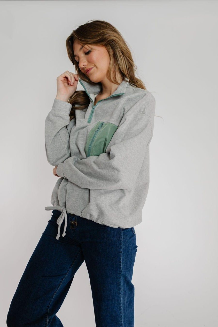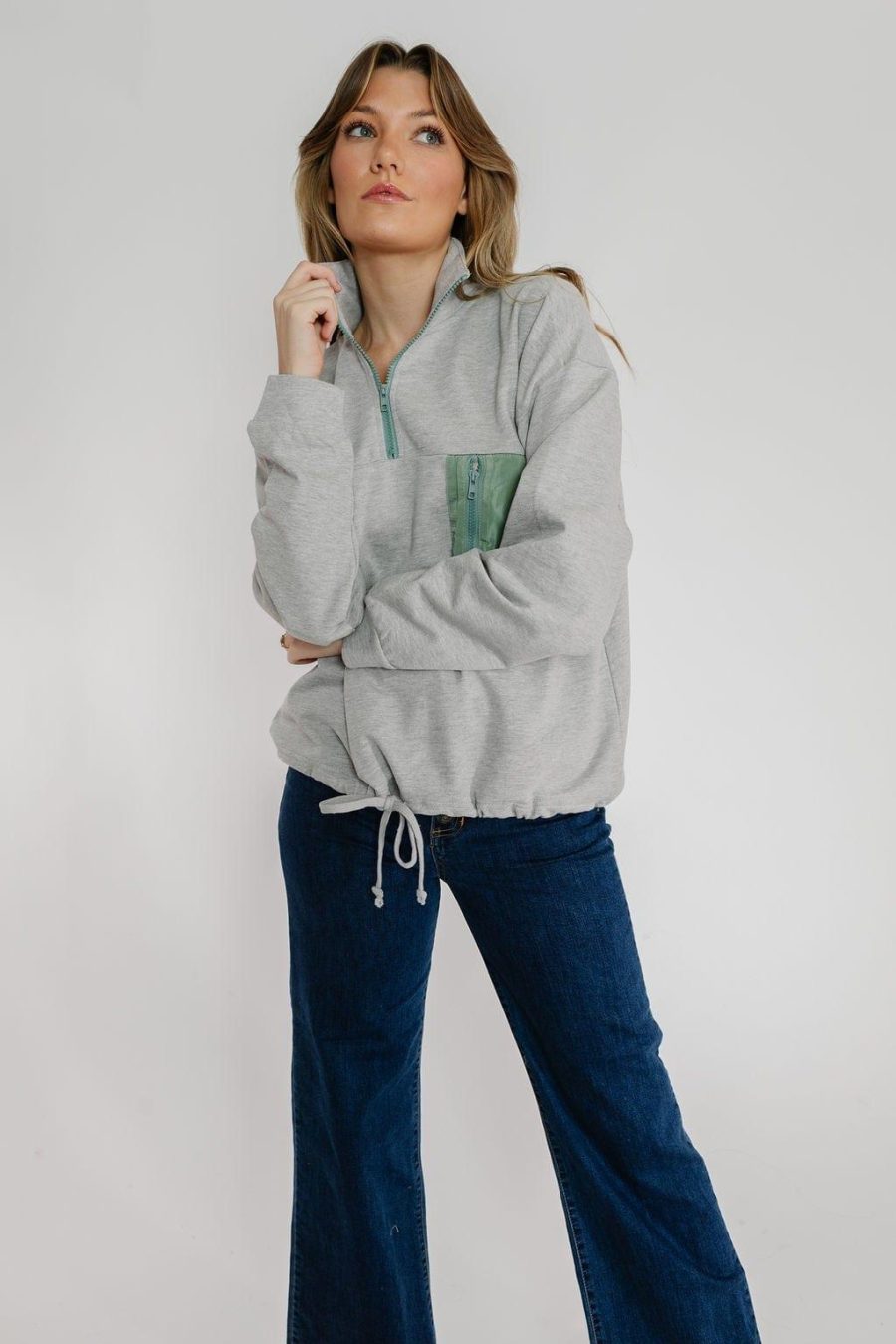 An easy, comfortable and soon to become favorite pullover lightweight jacket with a mock neck, dropped shoulder seams, partial zip front and contrast chest pocket with zipper. A drawstring at the waist adds to the silhouette of this relaxed, oversized pullover. Paired with our Scott denim